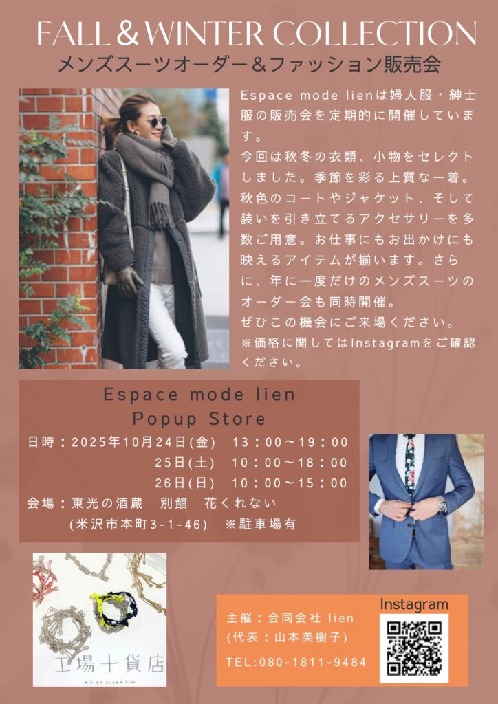 今回は秋冬の衣類、小物をセレクトしました。季節を彩る上質な一着。秋色のコートやジャケット、そして装いを引き立てるアクセサリーを多数ご用意。お仕事にもお出かけにも映えるアイテムが揃います。さらに、年に一度だけのメンズスーツのオーダー会も同時開催。ぜひこの機会にご来場ください。